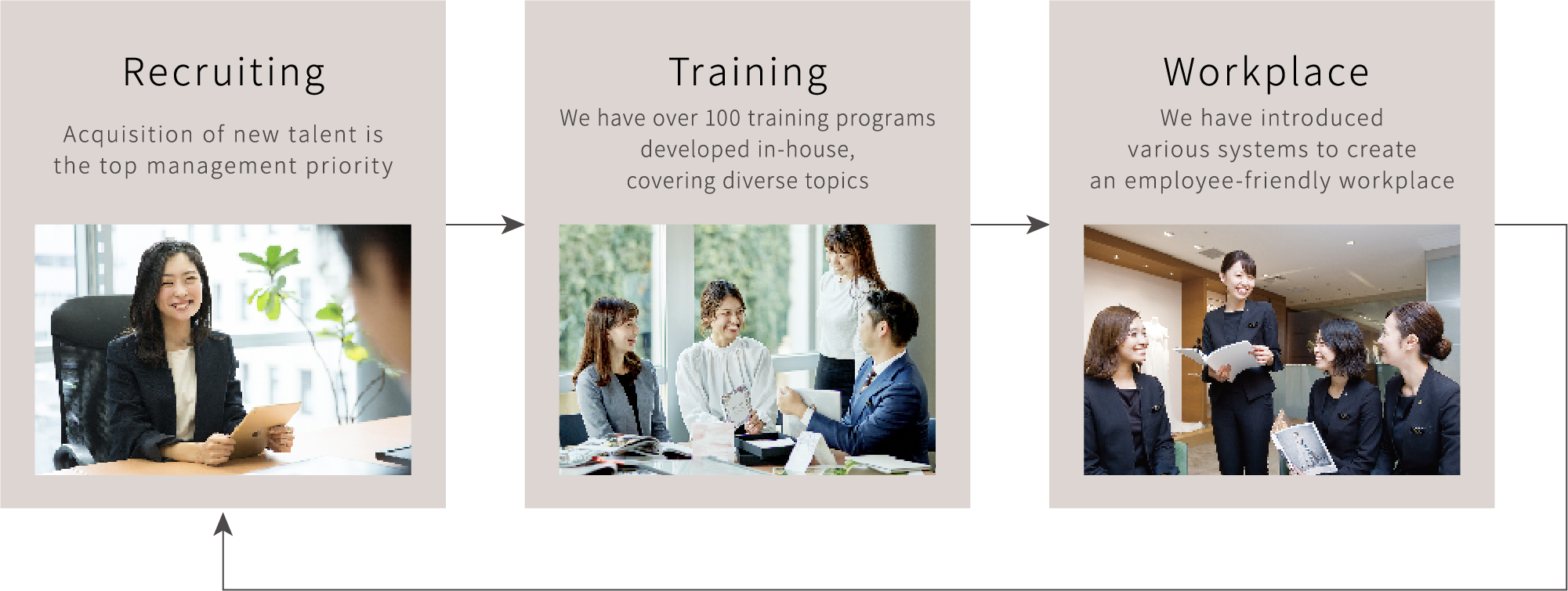 Since our founding, we have positioned human resources development as a key management issue. By hiring and training human resources who are aligned with our corporate management philosophy, we promote deeper understanding and penetration. We continuously run over 100 original training programs, all of which are developed and implemented in-house.