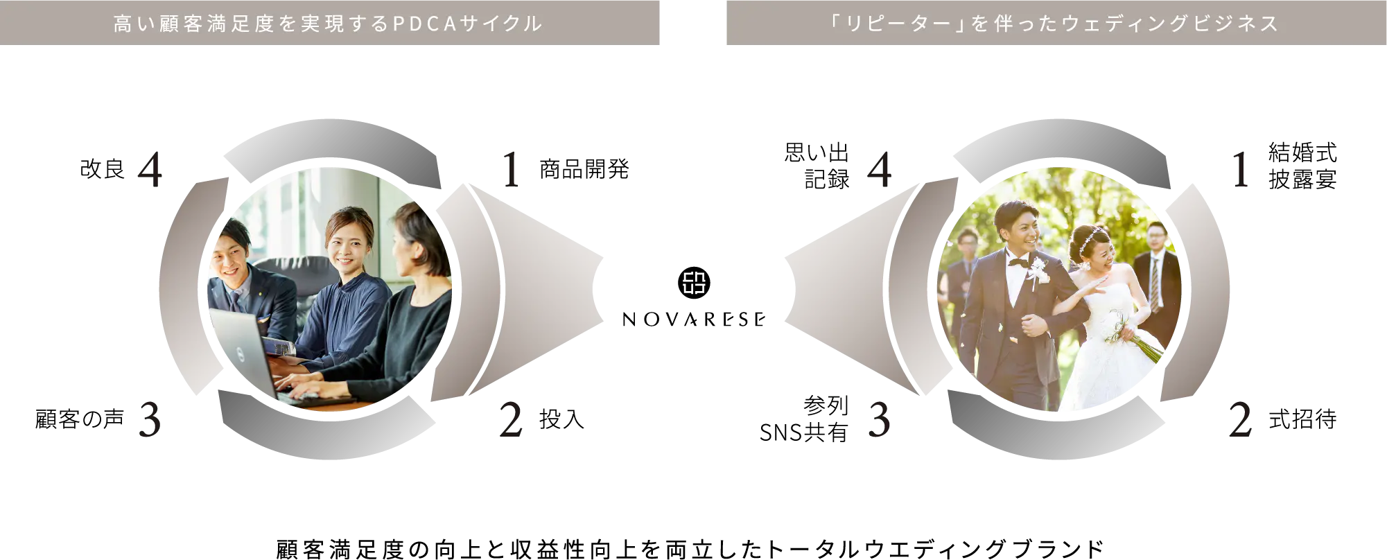 婚礼周辺サービスを内製化させたことにより、商品開発からサービス投入、顧客の声を反映した改良というPDCAサイクルを実現しています。また、参列者が潜在顧客であるという意識のもと、「参列したゲストから当社の結婚式が高く評価され、新たな集客に繋がる」という好循環モデルを生み出しています。