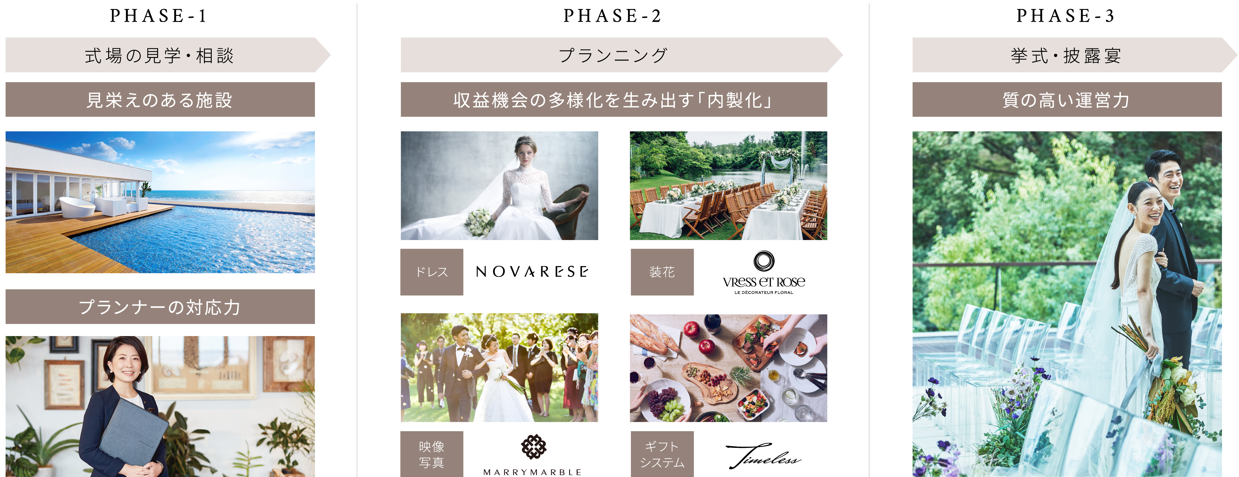 ご見学から結婚式当日までの各フェーズにおいて、当社の強みを有していますが、一番の強みは婚礼周辺事業の内製化であり、競合他社との差別化につながっています。