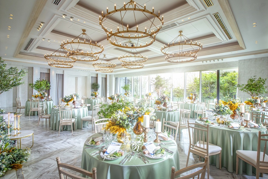 上質さと温かみを兼ね備えた披露宴会場では、ゲストとの距離が近いアットホームな祝宴が叶います。