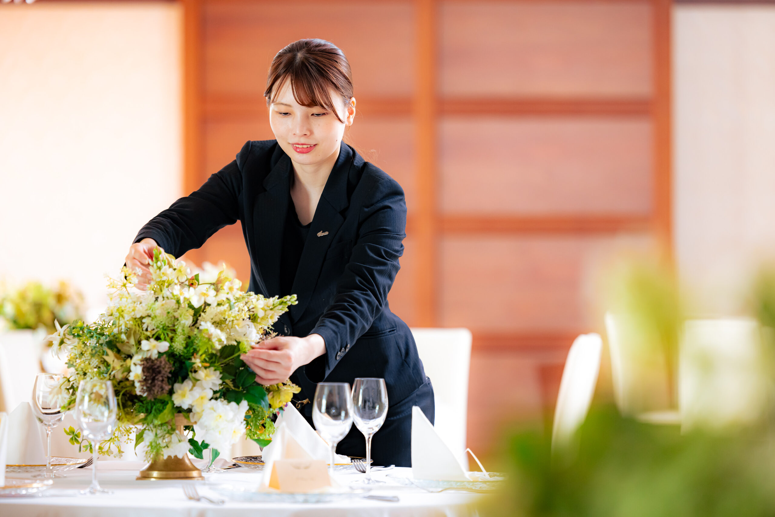 やりがいを感じるのは、お客様にとって人生で一度きりの大切な一日を、花というカタチで彩れる瞬間です。打ち合わせでうかがったエピソードや大切な想いをもとにご提案し、当日その空間を見て新郎新婦様が感動してくださったとき、「この仕事をしていて良かった」と心から思います。花はただの装飾ではなく、“想いを届ける手段”だと日々実感しています。フラワーコーディネーターは、お客様の想いを花というカタチにして、空間全体の世界観をつくる役割です。打ち合わせの中でおふたりの想い出やエピソードを拾い、それを花で表現することで、その日限りの特別な空間が生まれます。花は目に見えて記憶に残るからこそ、「花でその日の感動を記憶に残す」ことが、この仕事の価値だと感じています。また、オンザページは内製化しているため、職種の垣根を越えてコミュニケーションが活発です。全員が「どうしたらお客様にとって最高の結婚式になるか」を真剣に考えており、その熱量に日々刺激を受けています。忙しい中でも自然と助け合える空気があり、このチームで働けることにやりがいを感じています。私が大切にしているのは、「心で応えること」です。お客様が言葉にされない気持ちに気づき、ひとつひとつのご相談や表情の変化に向き合いながら、想いに寄り添って花に託す。それができたとき、初めて本当に「心に残る結婚式」をつくれると信じています。