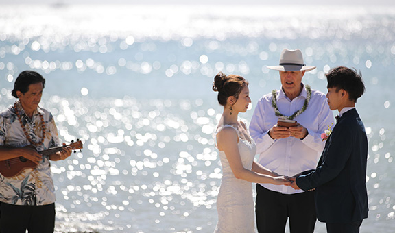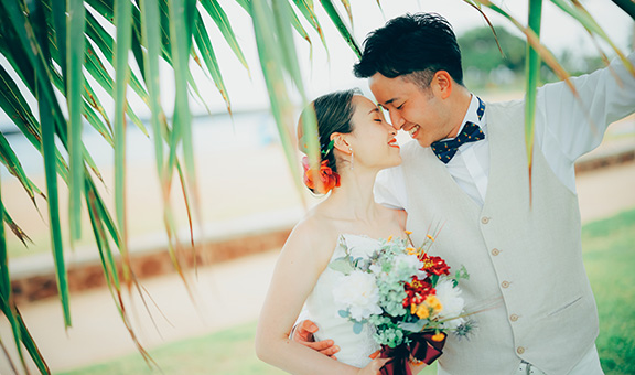 ハワイならではのセレモニースペースで行う挙式プランも充実しています。ウクレレ奏者が入ったハワイらしいビーチ挙式や貸切型プライベートガーデンでの挙式、歴史や由緒ある現地の教会、日系人や国際結婚にも人気の神社での和装挙式など、挙式プランも豊富に揃えています。