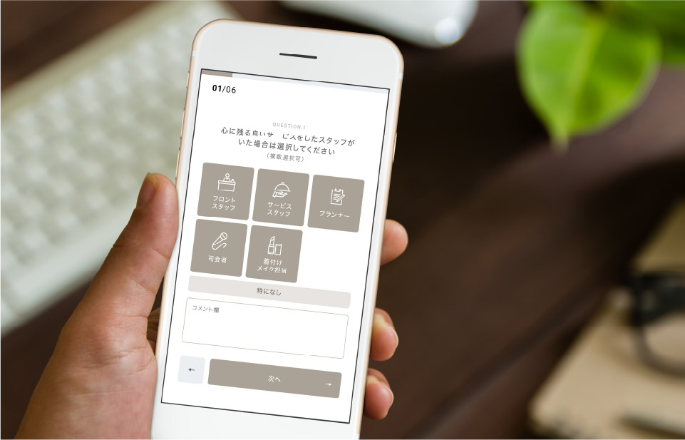 多様なニーズを把握し、サービス向上・顧客満足度向上につなげるため新郎新婦だけではなく、結婚式に参列したゲストにWEBアンケートを実施。カスタマーサービスセンターで集約・分析のうえ、社内の各部門に連携し、業務改善および商品・サービスの向上につなげています。