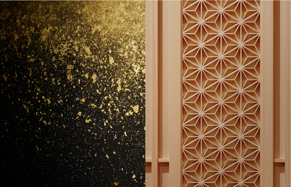網代天井(京都府)や金沢箔(石川県)、伊予絣(愛媛県)、美濃和紙・岐阜提灯(岐阜県)など、結婚式場の外観および内装、家具・照明に至るまで、その土地だからこそ出会える伝統的な建築技法や伝統工芸のモチーフを積極的に取り入れています。